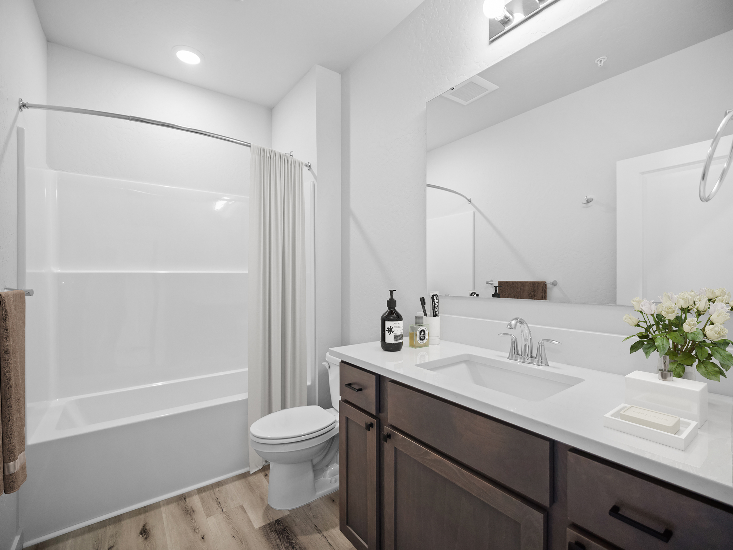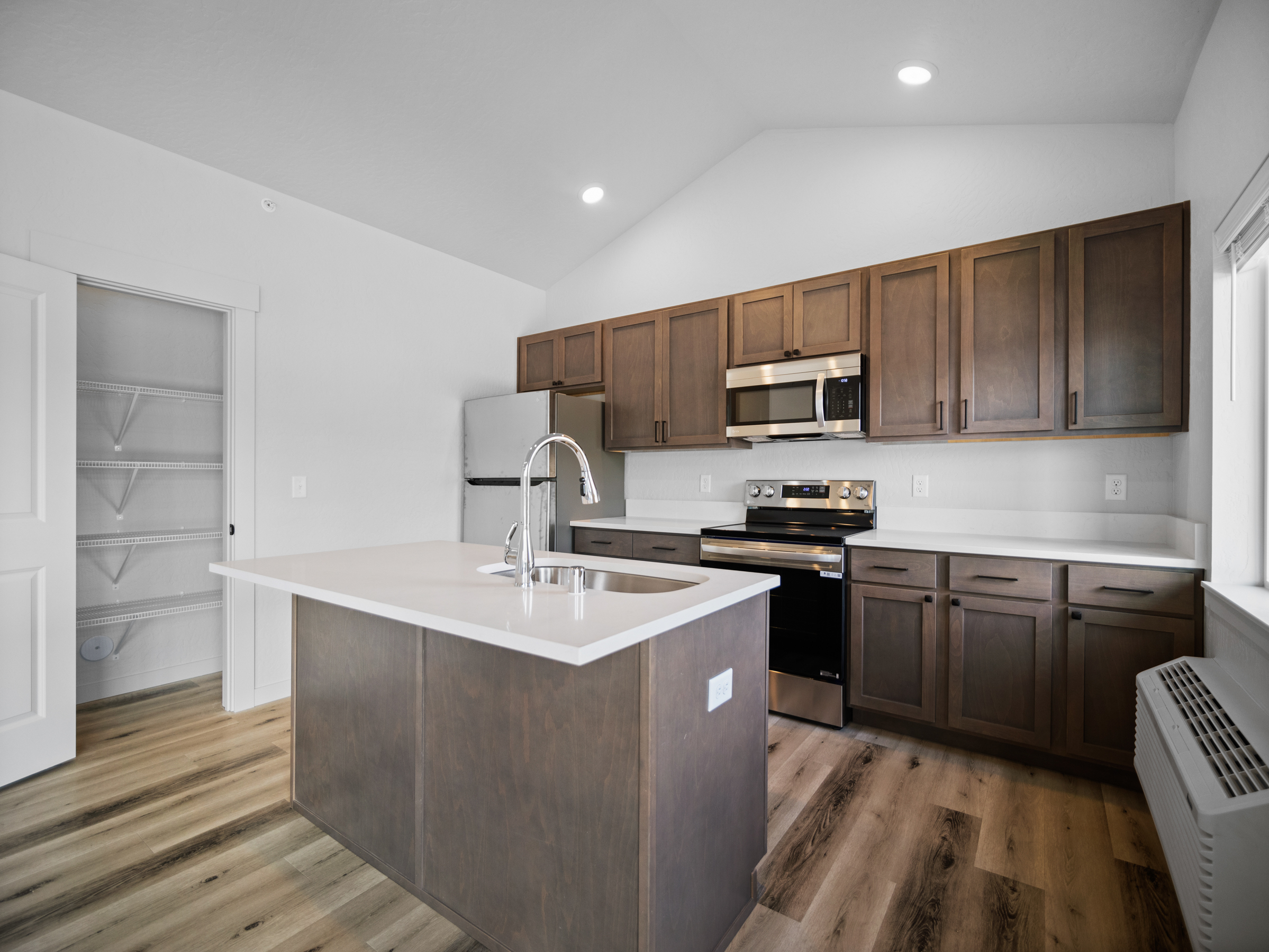 Each apartment showcases premium interior finishes, including quartz countertops throughout the kitchen and bathrooms, a spacious kitchen island, pantry storage, and soft-close shaker-style cabinetry. Luxury vinyl plank flooring runs throughout the unit, offering a clean, modern look with no carpet.